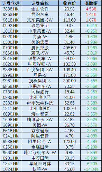 恒生科技指数成分股今日表现