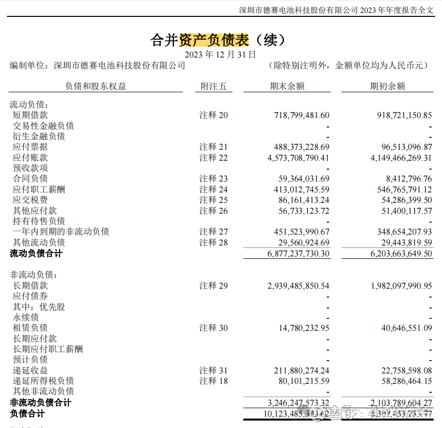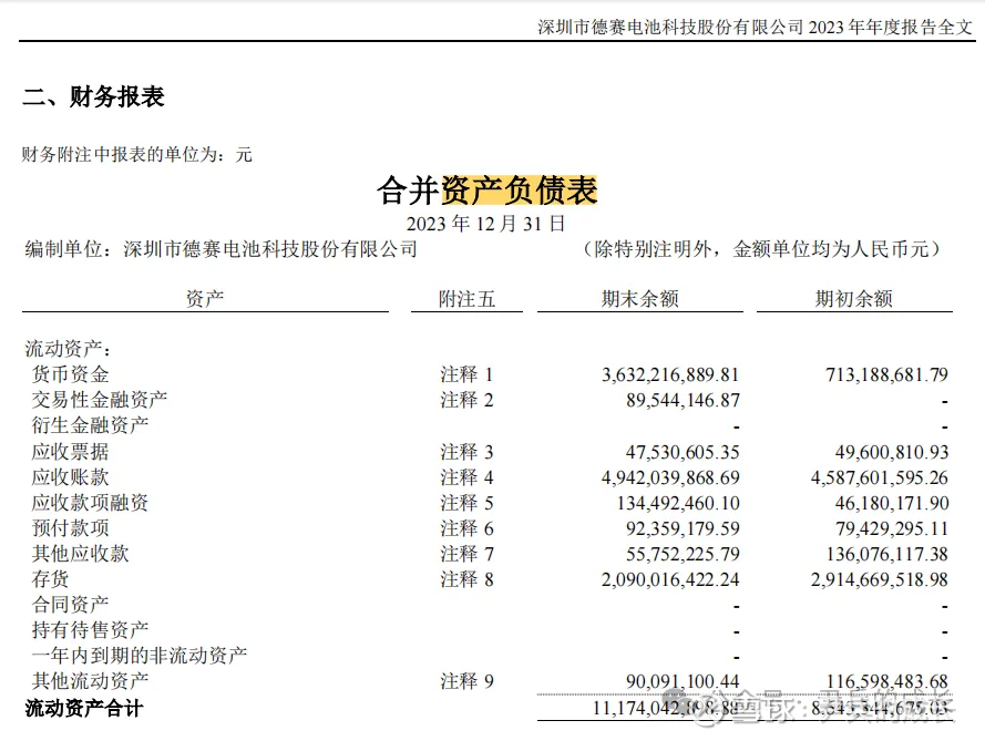 从德赛电池的2023年年报资产负债表中我们提取一下数据: