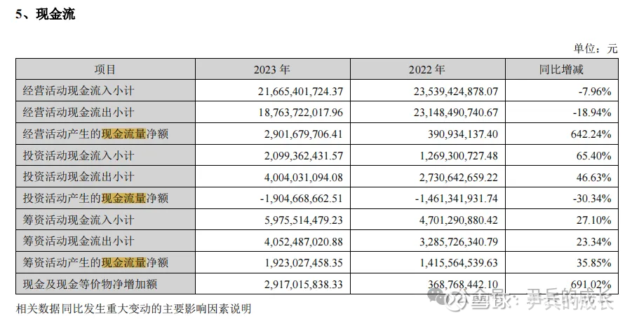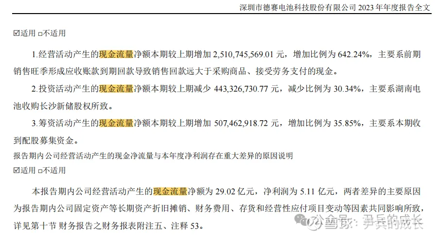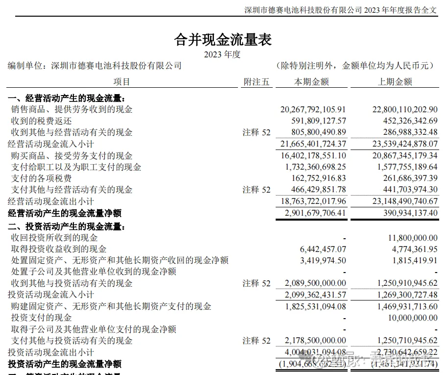 德赛电池经营活动产生的现金流量净额:29亿(是正数;远大于净利润5.11亿,非常健康);