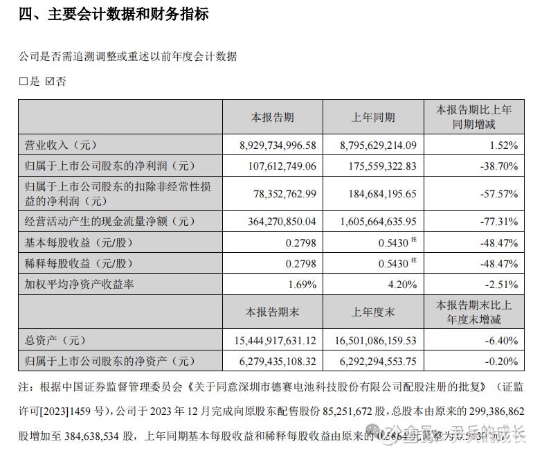 德赛电池2023年的总体营收较2022年同期下降了6.73%,净利润更是下降了35.13%。市场环境变的挺糟糕的。