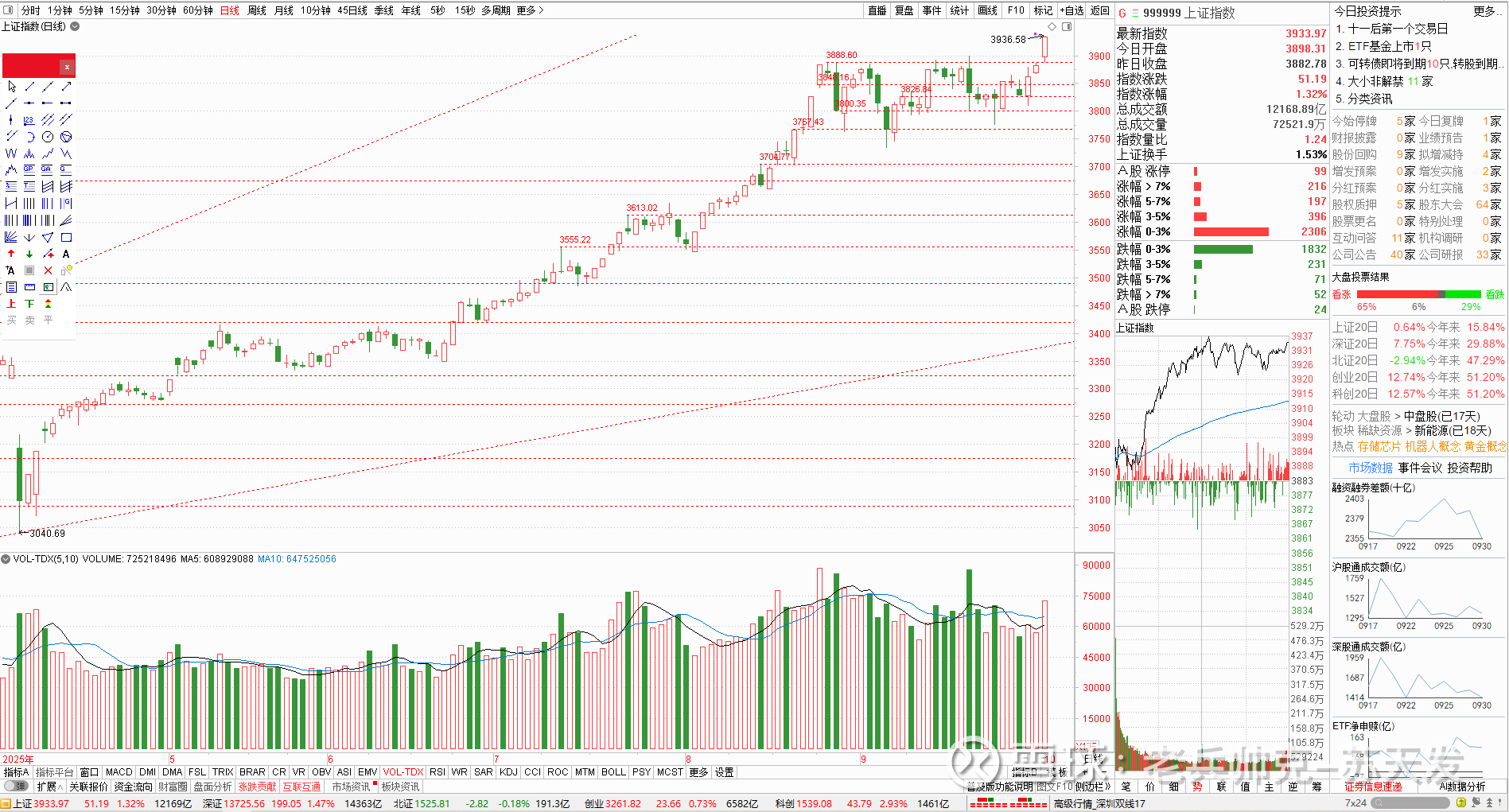 其中,上证涨了1.32%,深证涨了1.47%,北证微跌0.18,创业板涨了0.73%,科创板涨了2.93%。沪深北三市5435只个股,上涨3115只,涨停99只,下跌2186只,跌停34只,总体行情还是不错。