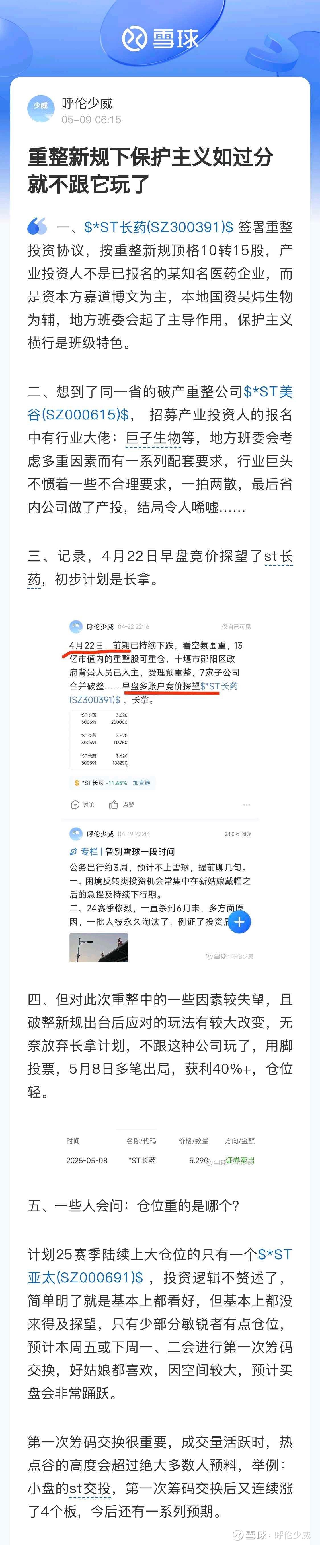 $*ST长药(SZ300391)$ 被立案,是有些征兆的,例如挂星st为何迟迟拿不到证监会无异议函,迟迟未出各种保壳方案……大A充满了各种风险,投资要慎重。但悲观中也要理性,创业板20cm出来较容易,且最惨情况预计也是过一时期,大A的赌徒很多的,有的就喜好博弈这口,不用过于担心资金出不来的问题。