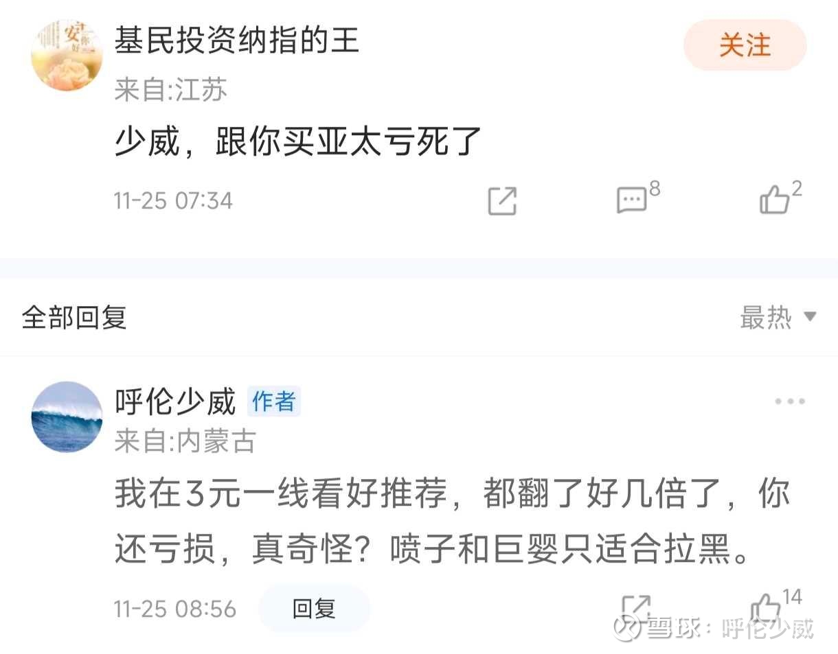 $*ST亚太(SZ000691)$ 终于裁定受理重整了,未受理前喷子、巨婴、碰瓷的垃圾人横行。例:少威,跟你买亚太亏死了(如图)。@呼伦少威 回复:我在3元一线看好推荐,都翻了好几倍了,你还亏损,真奇怪?喷子和巨婴只适合拉黑;而时常分享投资逻辑的博老师居然被喷为“老博狗”。