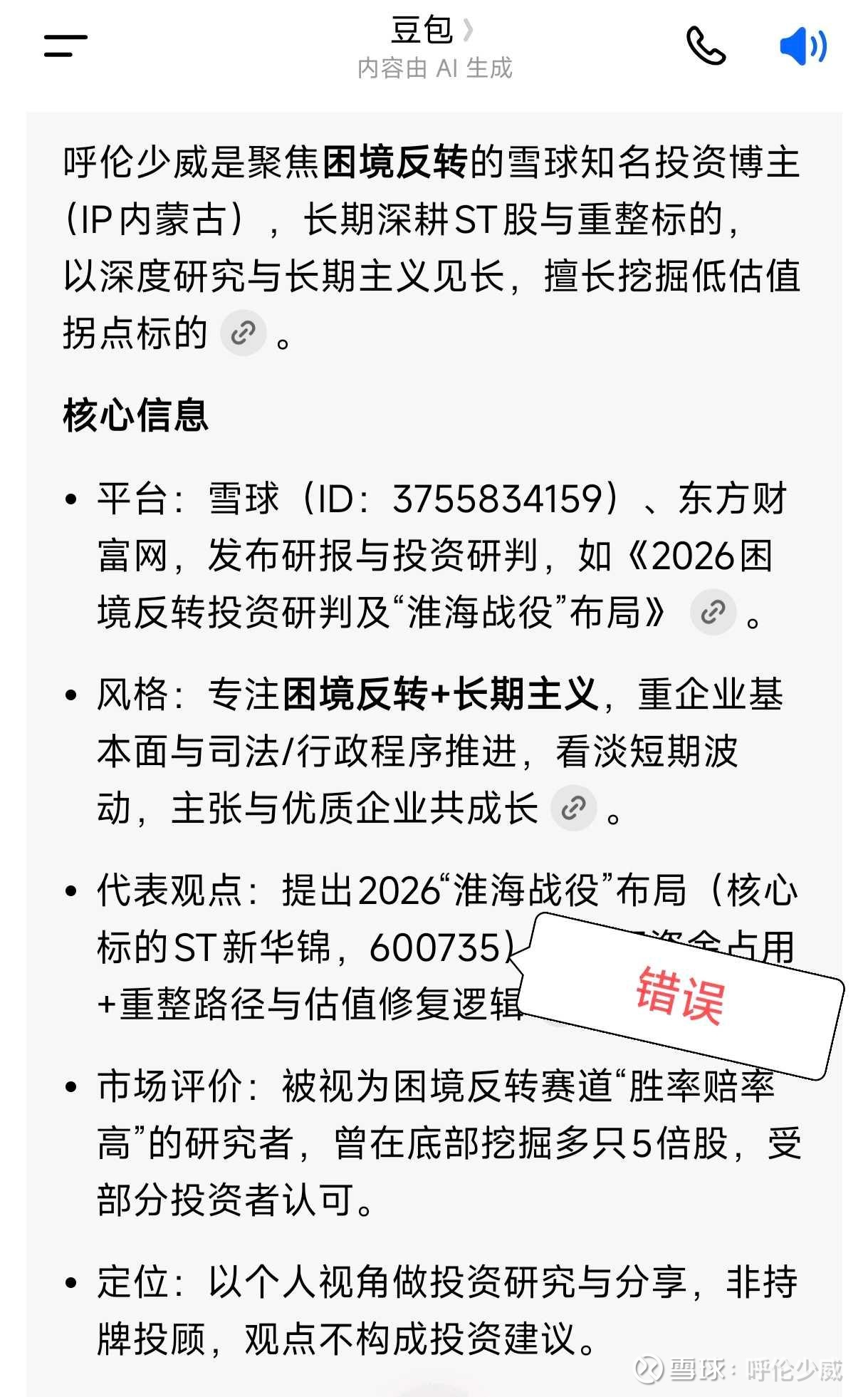 1. 呼伦少威系聚焦困境反转投资的雪球普通博主,非知名投资博主。