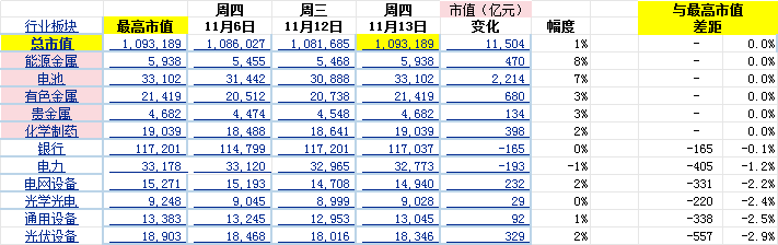 这11个行业是这次距离市值高点回撤低于-3%的,有5个行业处于10月后的市值新高。