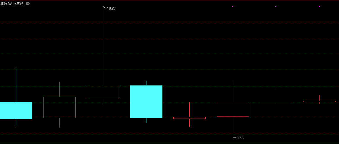 北汽蓝谷上一波冲到19.87就是和华为合作HI模式,但极狐开始的拉胯让这个周期变得非常短,一年都没坚持下来,所以个股周期变化更多,也非常受基本面的影响,尤其按年线来看。