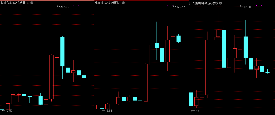 长城、比亚迪和广汽是同一批,但比亚迪凭借新能车的成功是走了两波的,第二波很明显的两年主升,调整两年,再两年的主升。