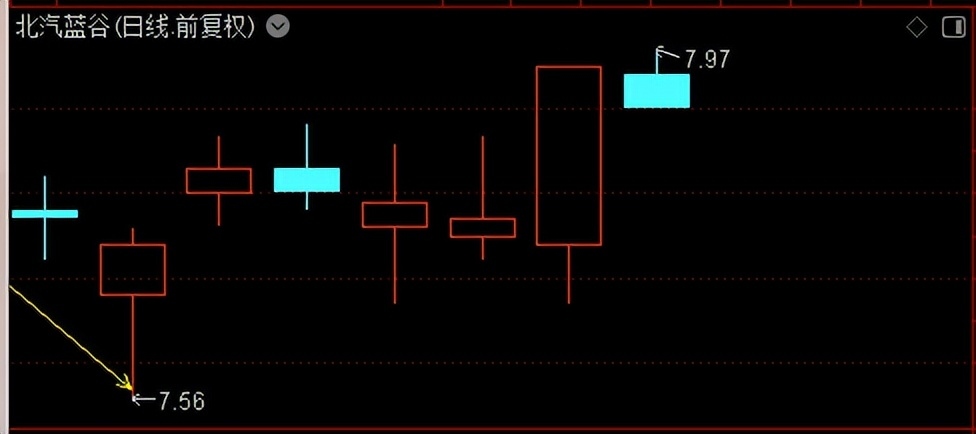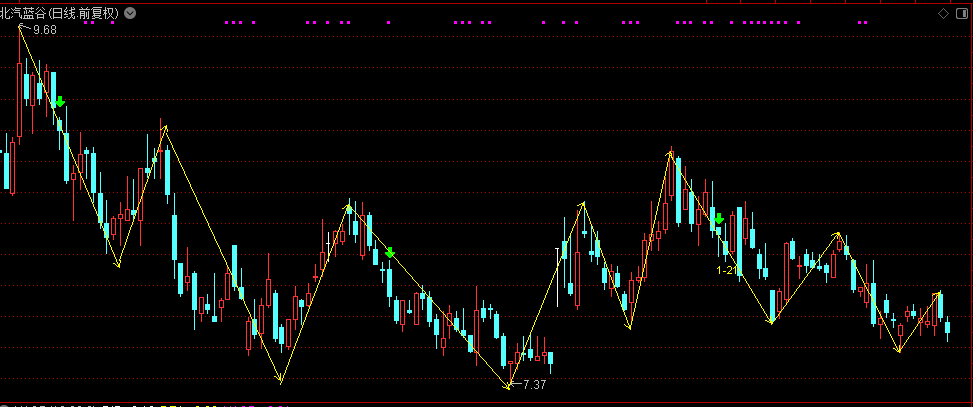 近看北汽蓝谷,今天开盘就确认了一个新的上涨趋势,近看不像,但技术上确实都符合,7根K线,低点在7.56元,今天形成了趋势的高点,7.97元。
