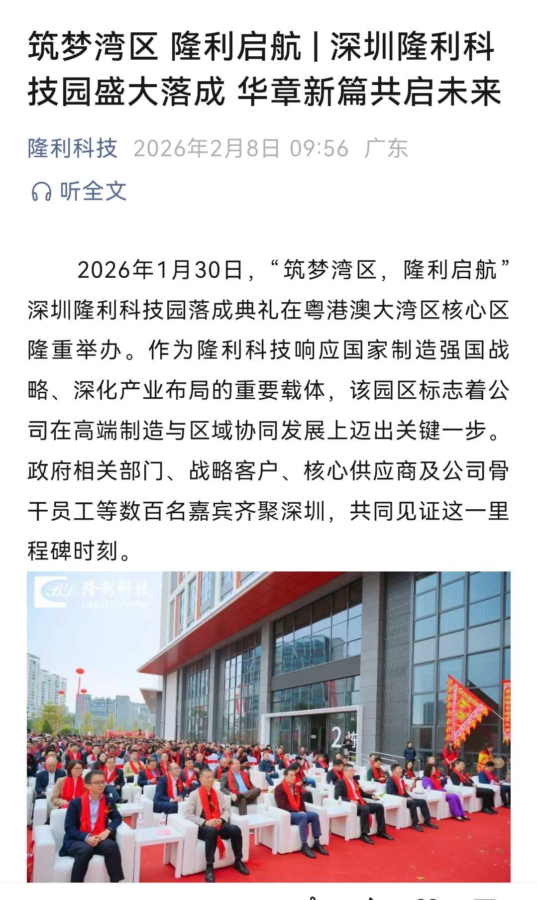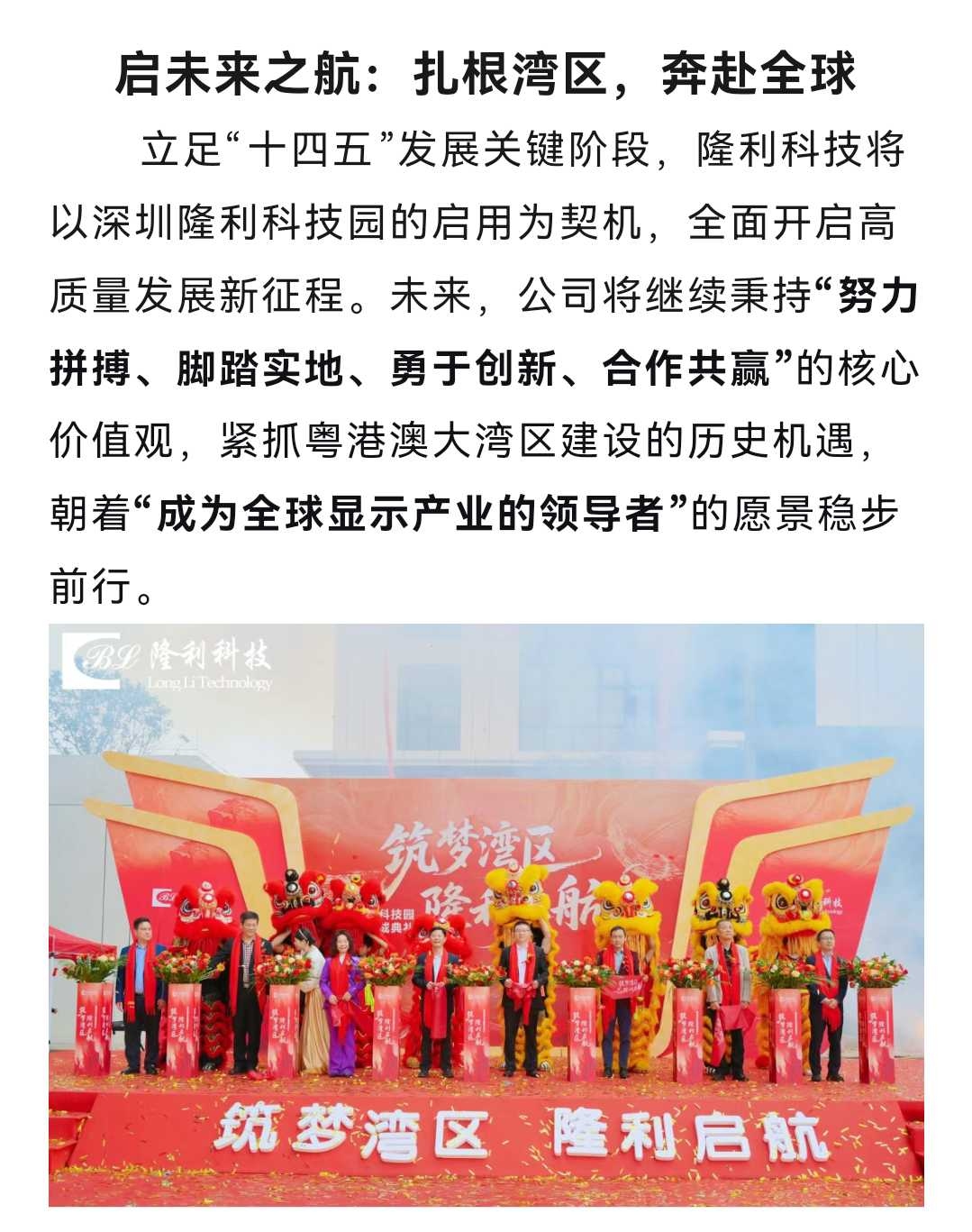 隆利科技将以深圳隆利科技园的启用为契机,全面开启高质量发展新征程。未来,公司将继续秉持“努力拼搏、脚踏实地、勇于创新、合作共赢”的核心价值观,紧抓粤港澳大湾区建设的历史机遇,朝着“成为全球显示产业的领导者”的愿景稳步前行。