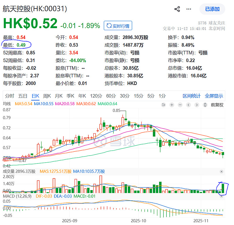 $恒生指数(HKHSI)$ $航天控股(00031)$ 今天放量探到10日月线0.5元,收盘的大概率在0.53元,航天控股(00031)的短期底部已经出来。