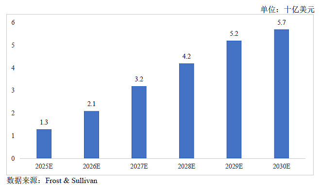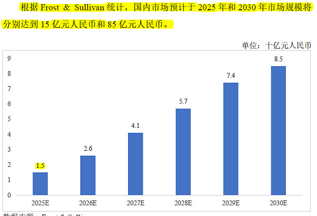 根据Frost & Sullivan 统计,国内市场预计于2025 年和2030 年市场规模将分别达到15 亿元人民币和85 亿元人民币。