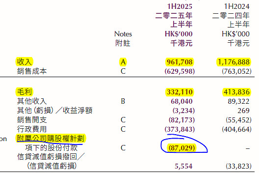 $恒生指数(HKHSI)$ $高阳科技(00818)$ 2025年中报扣除附属公司购股权计划费用(0.87029亿)后,高阳科技 2025 年上半年实际盈利为59,886 千港元(0.599 亿港元),所以正常年份每年应该有1亿以上的利润。