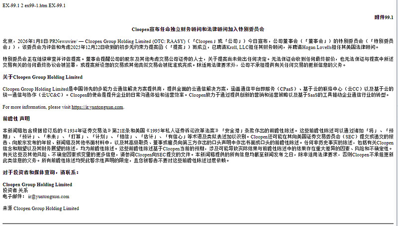 $恒生指数(HKHSI)$ RAASY(RAASY) Cloopen宣布,其特别委员会已任命Kroll, LLC为财务顾问,Hogan Lovells为美国法律顾问,以评估2025年12月22日收到的无约束力私有化提案。顾问们将协助审查该初步提案。