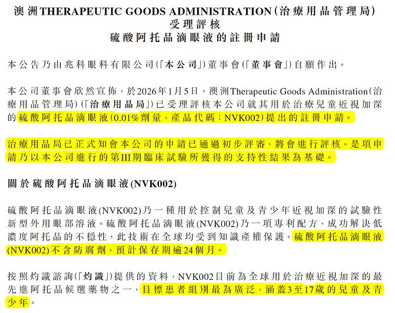 $恒生指数(HKHSI)$ $兆科眼科-B(06622)$ 2026年1月5日,澳洲治療用品局已受理評核本公司就其用於治療兒童近視加深的硫酸阿托品滴眼液(0.01%劑量,產品代碼:NVK002)提出的註冊申請。