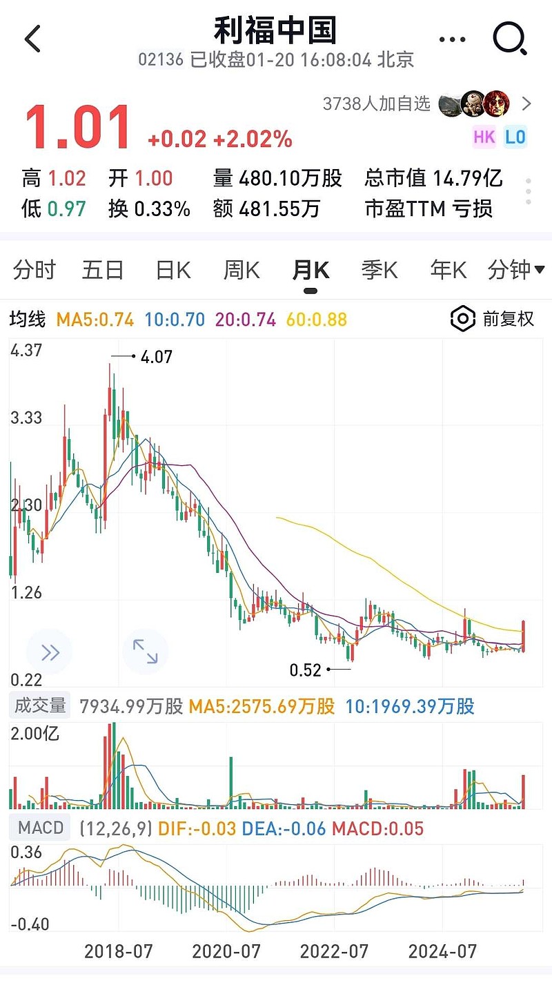 $恒生指数(HKHSI)$ $利福中国(02136)$ 难得一见的一根巨阳月线其实不压低股价反手做多,以利福中国(02136)的筹码分布和厚实的资产家底,只要持续释放价值恢复派息做大市值,也是非常好的选择。带来的好处比如:1、利福中国(02136)市值大了后也可抵押贷款。2、股价高后可以减持套现。3、利福中国良好的市场表现也可提升刘总的商业信誉和口碑。