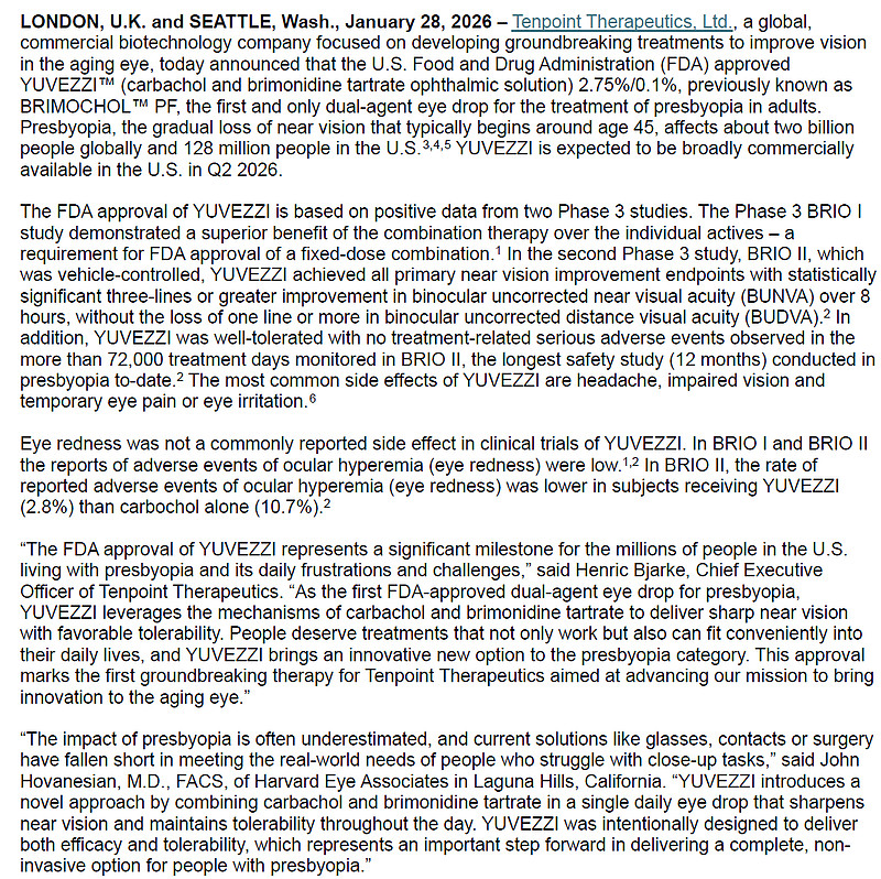 2026 年 1 月 28 日,Tenpoint Therapeutics宣布YUVEZZI™获美国 FDA 批准,兆科眼科-B(06622)具有该药的亚洲(包含中国),非洲,大洋洲权益。它是首款且唯一用于治疗老视的双效滴眼液,成分为 2.75% 卡巴胆碱和 0.1% 酒石酸溴莫尼定;该药物基于两项关键 3 期试验(BRIO I、BRIO II)数据获批,试验纳入超 800 名患者,其中 BRIO II 是目前针对老视滴眼液最长的安全性研究(持续 12 个月);YUVEZZI 每日 1 滴即可在 30 分钟内起效,瞳孔收缩效果持续 10 小时,能显著改善近视力且不影响远视力,常见副作用为头痛、视力模糊、暂时性眼痛或刺激,眼充血发生率低(仅 2.8%),预计于2026 年第二季度在美国全面上市,为全球约 20 亿、美国 1.28 亿老视患者提供了便捷无创的新治疗选择。