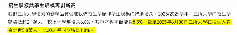 $恒生指数(HKHSI)$ $东软睿新集团(09616)$新学期在校生规模突破5.9万人,比起中报披露的5.8万人增加1千人,搞钱的高教基本盘还是不错,医养板块的亏损已经清楚,预计2025年全年每股0.7元以上,如果按照前2年50%盈利派息,现价股息率超过10%。东软睿新集团(09616)大股东持股接近75%也是拿大头,关键是其通过教育資源輸出板块能够将利润汇到香港派息,比起$中国新华教育(02779)$ 这些有钱但分不出钱的高教股自在。