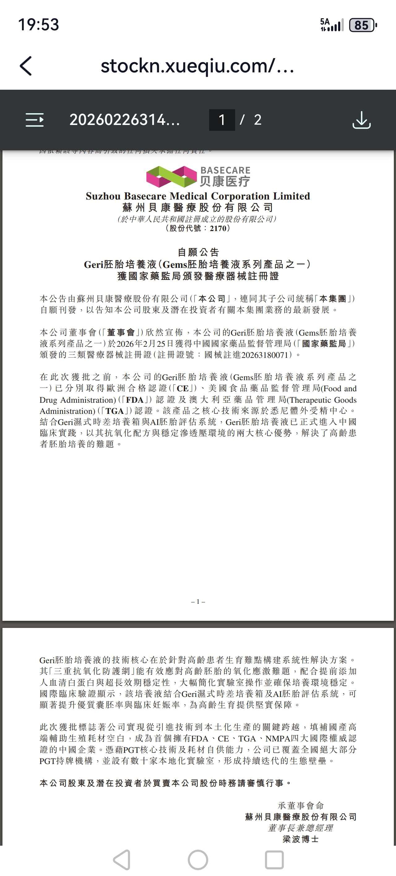 $贝康医疗-B(02170)$ 开年大喜,贝康医疗-B(02170)发布公告,本公司的Geri胚胎培养液(Gems胚胎培养液系列产品之一)于2026年2月25日获得中国国家药品监督管理局(“国家药监局”)颁发的三类医疗器械注册证(注册证号:国械注进20263180071)。