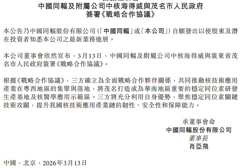 $恒生指数(HKHSI)$ $中国同辐(01763)$中核海得威与茂名市人民政府于 2026 年 3 月 13 日正式签署《战略合作协议》,背后的项目是生产高纯度天然丰度 ¹³CO,依托茂名石化炼化一体化配套优势,获取稳定低成本的高纯 CO 资源,产能达 2000 kg ¹³CO/ 年