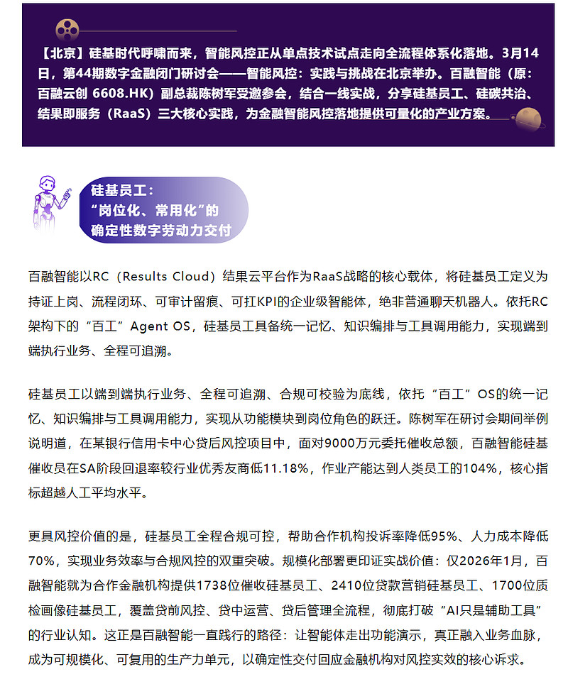 技术底座:依托 **“百工” AgentOS**,实现硅基员工统一记忆、知识编排与工具调用,全程可追溯、合规可校验。