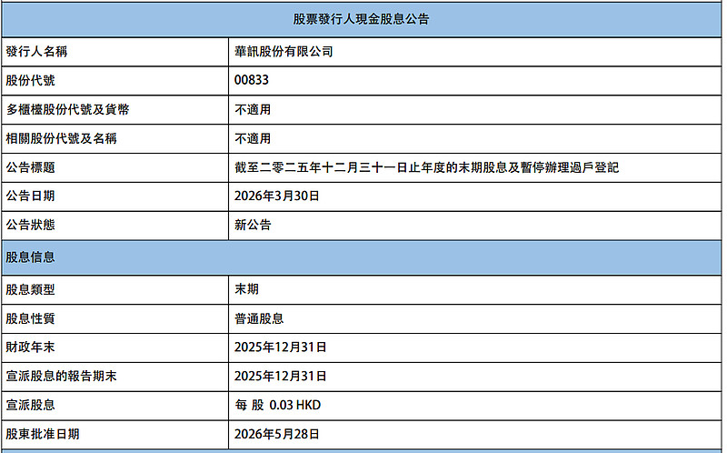 $恒生指数(HKHSI)$ $华讯(00833)$ 年报股息0.03,加上中报0.03,全年0.06元,厚道的大股东与管理层 感谢