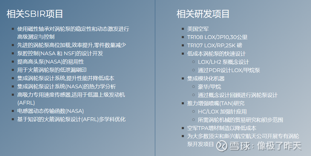 更关键的是,这家公司深度绑定了全球顶级航天客户:它不仅入选了 NASA 的 SBIR(小企业创新研究计划)第二阶段,承担 “用于 LOx/LH2 应用的集成布雷顿低温冷却器” 项目,还为美国空军执行 TR108 LOX/JP10、TR107 LOX/RP25K 磅等军用涡轮泵项目,甚至为全球顶尖商业航天企业提供专属涡轮泵定制服务。这些项目不仅是技术实力的证明,更是未来商业航天爆发期的订单保障。