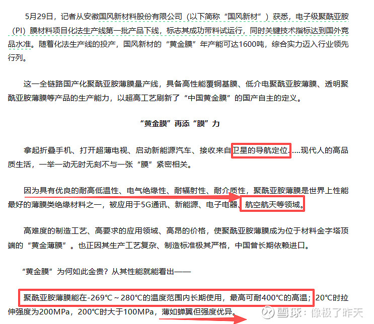 因为具有优良的耐高低温性、电气绝缘性、耐辐射性、耐介质性,聚酰亚胺薄膜是世界上性能最好的薄膜类绝缘材料之一,被应用于5G通讯、新能源、电子电器、航空航天等领域。