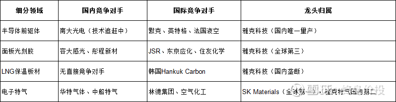 雅克科技原以阻燃剂业务为主,通过多次并购(如韩国UPChemical、LG化学光刻胶事业部)转型为平台型电子材料企业。目前主营业务涵盖半导体前驱体、光刻胶、LNG保温板材、电子特气、阻燃剂几大板块,客户包括三星、SK海力士、台积电、沪东造船厂等全球龙头。公司是国内唯一通过法国GTT认证的LNG保温板材供应商,在半导体前驱体领域市占率国内第一,全球份额约10%-15%,是国产替代的核心标杆企业。