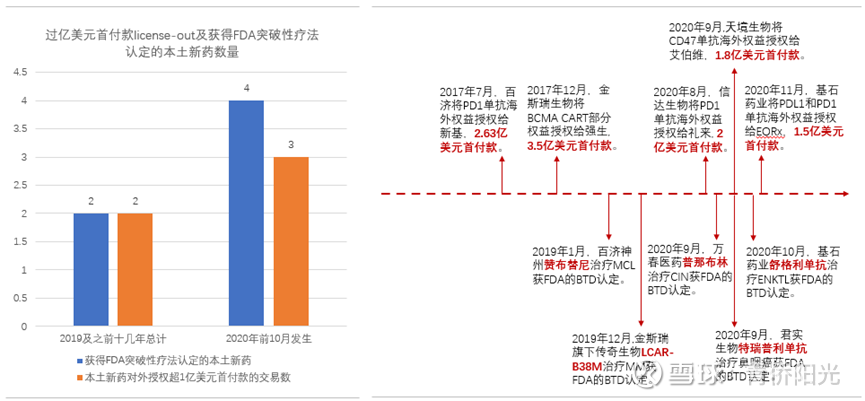 “供给泡沫也并非都是坏事,泡沫吸引了巨大的社会资源投入,如果这里的方向本来就是个大趋势,那泡沫是有可能加速行业的发展和跃迁的。以本土的创新药为例,能真正说明一款创新药的国际better竞争力有两个可参考的硬核指标,一个是超1亿美元首付款的高价值对外授权,另一个是获得FDA的突破性疗法认定。首付款是不可退回的,1亿美元的意向金不是小数目,对方愿意高价收购无形资产,说明这些海外主流药企看好这款产品的性能优势和市场潜力;FDA的突破性疗法对产品有很高要求,需要相比已有的标准疗法有真正的突破性优势,创新药能获得这样的认定,表明产品的突破性性能优势已经得到了FDA的认可。2017年之前的几十年,无一例高价值对外授权、也无一款获得FDA突破性疗法认定,在本土创新药的硬核国际化进程上,2017年之前犹如“史前历史”般的荒芜。但仅仅过去3-4年,中国本土创新药企已经囊获了一大批的高价值对外授权交易和突破性疗法认定。这里有一部分是中国ICH的影响,但最根本的还是,2011年后尤其是2015年后中国成立了一批真正拥有国际视野的创药新势力,它们研发出了一批拥有真正国际竞争力的创新药。这些产品会在未来5-10年逐渐上市贡献营收,我们可能正在见证来自本土的世界级大药和世界级药企的诞生。”