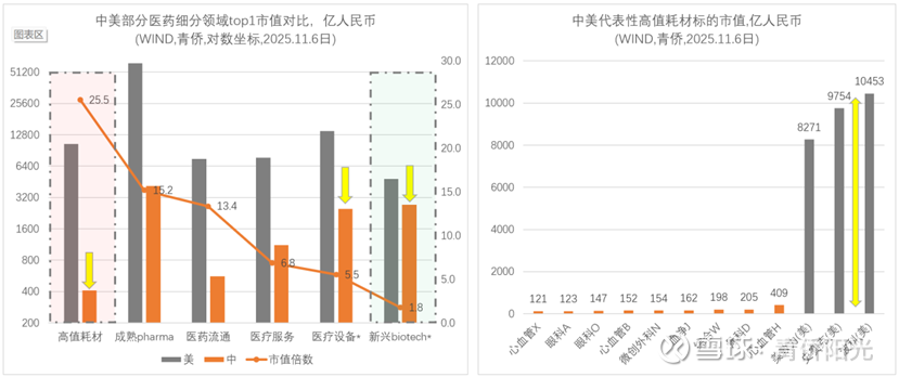 如下图所示,受益于BD热潮下的全球化叙事,国内新兴创新top1药企的市值已经快要追平海外top1新兴药企,同样是暂时还不能盈利的中后期biotech公司,A股某双抗ADC药企市值已经接近1500亿人民币,而美股同类公司中市值最大的也不到400亿美元。但在高耗领域里,国外高耗为主营的头部公司市值已超10000亿人民币,多家大几千亿,另外总市值数万亿人民币的强生、雅培等综合型公司的高耗业务若单独拆分预计也是大几千亿甚至上万亿市值;相比之下,国内除了1家外其它市值最大的也就堪堪接近200亿人民币,空间更具吸引力。
