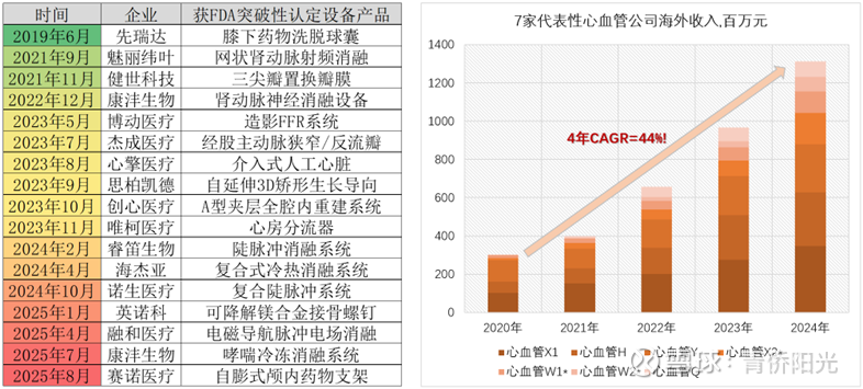看两组数据:下面左边的表格是历年获得FDA突破性认定的国产高耗产品名单,2019年之前一款都没有,但2023年开始短短3年就涌现了十几款;FDA的突破性认定标准非常严苛,因此这一指标在近年的爆发性涌现,能非常直观地展现出中国高耗创新的国际竞争力的快速崛起——这里的创新崛起是行业性现象,并不仅仅局限于表格列示的产品和公司,以我们所覆盖的港股上市高耗为例,一半以上的公司都在布局国际原创业务,不少公司已经能够看得到。下面右图是7家A股/港股上市心血管高耗标的的海外收入变化,这7家公司2020年时海外营收还只有3亿,到了2024年已经飙升到13亿,4年年化营收增速高达44%!