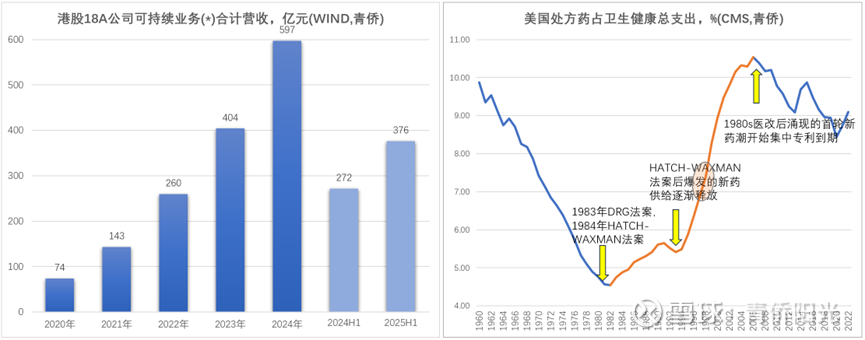 下面左图是港股18A公司的可持续业务营收变化,18A是港股为未盈利生物科技公司额外开设的上市通道,合计营收主要来自国产创新药企,过去几年的增长非常强劲,今年从中报和部分三季报看,仍然维持了高景气高增。