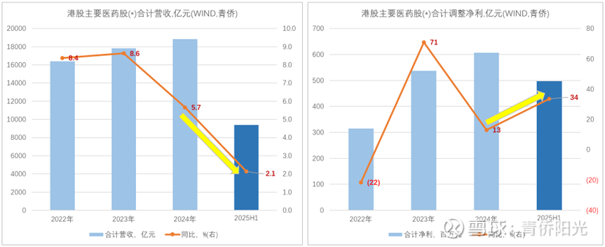 下面左图是港股主要医药股合计营收及其增速变化,由于港股汇集了国控、华润、上药这三家TOP3医药流通企业,因此,其合计营收增速变化很大程度上代表了医药行业总盘子的增速变化,可以看到医药营收总量增速在2024年有所放缓,到2025上半年进一步放缓。背后的原因,我们的理解是受到了2024年DRG全国全面落地带来的阶段性扰动:对于某些医保统筹区的医院和医生来说,之前的DRG是模拟运行没有太深感受,现在是正式运行、直接利益攸关,在全面落地的初期阶段更容易倾向于谨慎,容易压抑需求释放;不过,随着大家对政策的逐渐适应,那些既契合DRG理念又契合医院/医生切身利益的诊疗需求,可能会重新得到释放,从而带动总量增速的恢复。从A股医药的季报财务数据看,2025Q3的行业总量增速或已企稳并有微幅回升——如果我们理解没错的话,未来3年,我们很可能会看到医药行业总量增速的趋势性回升,并逐渐向6%-9%的新稳态增速靠拢。