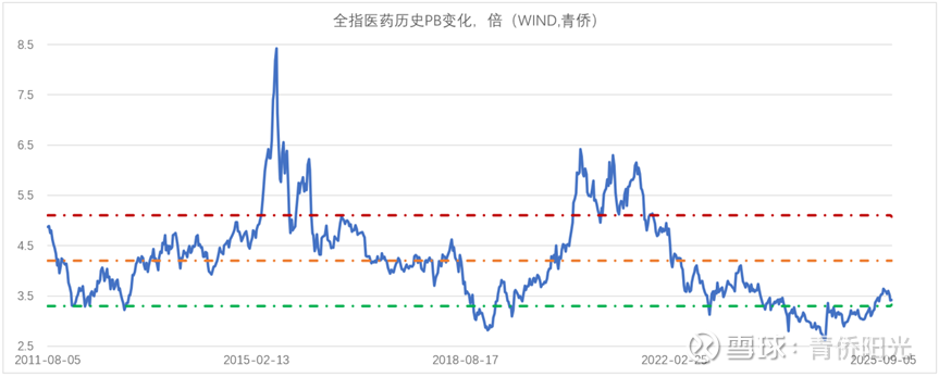 不过,行业总量层面的改善似乎并未得到市场的认同。除了上文提到的主动权益基金医药持仓权重显著低于历史均值之外,下图展示的全指医药PB估值也处于历史的低位水平,相对其它行业板块处于明显弱势状态。