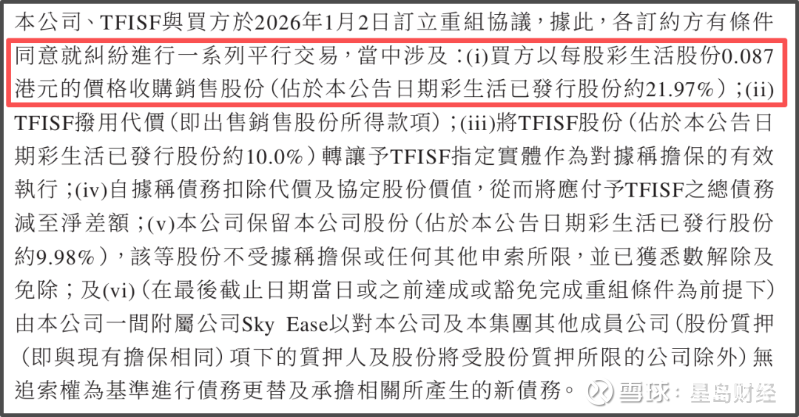 2026年1月2日晚间,花样年公告称,公司与天风国际证券与期货有限公司(下称“TFISF”)及买方公司Splendid Fortune Enterprise Limited订立重组协议,通过“卖股+抵债”组合方案化解债务。其中买方以0.087港元/股价格收购彩生活(01778.HK)约21.97%股份(对应约4.08亿股),而该买方由花样年创始人、控股股东曾宝宝间接控股67.36%。