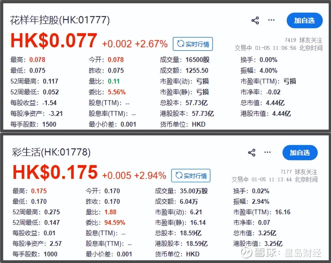 受债务纠纷解决的消息带动,1月5日早盘花样年股价高开,截至11时左右涨2.67%,报0.077港元/股;彩生活上涨2.94%,报0.175港元/股。