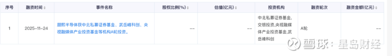 《星岛》查询的公开资料显示,三个月前的2025年11月24日,朋熙半导体曾完成A轮融资,投资机构包括中北私募证券基金、交银投资、央视融媒体产业投资基金和武岳峰科创等。其中,中北私募证券基金属泸州老窖集团旗下国有全资企业;武岳峰为上海自贸区注册企业,由三位清华校友企业家共同创办,投资案例包括瑞芯微电子(603893.SH)、英集芯科技(688209.SH)和星环聚能等科技公司。