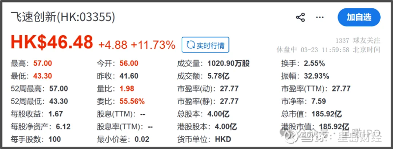 3月23日,飞速创新(03355.HK)正式登陆香港联交所主板,以56港元/股高开,至午市休盘,报46.48港元/股,上涨11.73%,总市值达185.92亿港元。