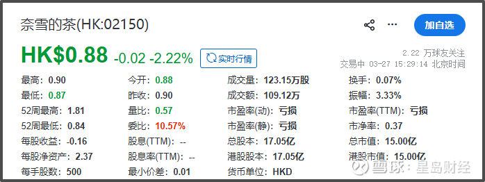 截至3月27日收盘,奈雪的茶港股报0.88港元/股,下跌2.22%,总市值15亿港元。