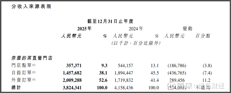 从收入来源看,奈雪的茶的营收结构已发生变化。其2025年来自外卖订单的收入为20.09亿元,同比增长11.2%,占直营门店总收入比例由上年41.4%大幅提高至52.6%,而来自自提订单和门店点单的收入则分别同比减少7.4%和3.8%。