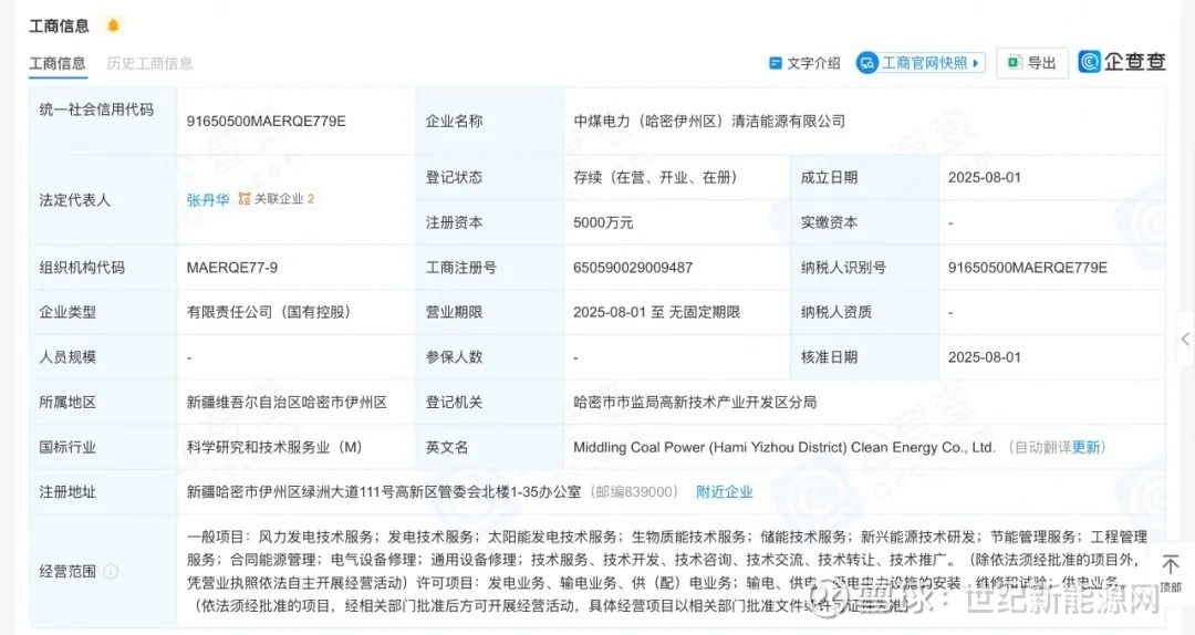 近日,中煤电力(哈密伊州区)清洁能源有限公司成立,法定代表人为张丹华,注册资本为5000万元。