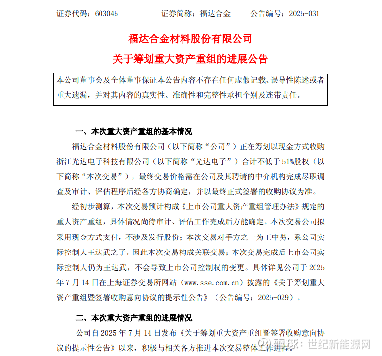 8月13日,福达合金发布了,关于筹划重大资产重组的进展公告,本次交易完成后,浙江光达电子将成为公司控股子公司。具体情况尚待审计、评估工作完成后方能确定。