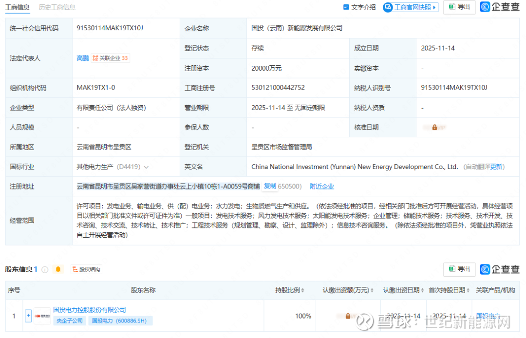 11月14日,国投(云南)新能源发展有限公司成立,注册资本2亿元。股东及出资信息显示,该公司由国投电力控股股份有限公司全资持股。