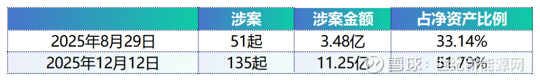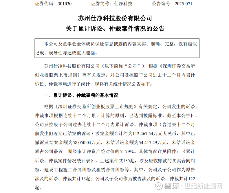 2025年8月29日,仕净科技首次披露的累计诉讼仲裁公告显示,过去十二个月内公司及控股子公司涉案51起,累计诉讼、仲裁事项涉案金额约3.48亿元,占最近一期经审计净资产绝对值的33.14%。