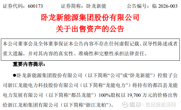 1月8日,卧龙新能发布公告称,控股子公司龙能电力将持有的都昌县龙能电力发展有限公司(以下简称“都昌龙能”)100%股权出售予浙江龙柏集团有限公司(以下简称“浙江龙柏”),交易价格为1.97亿元。