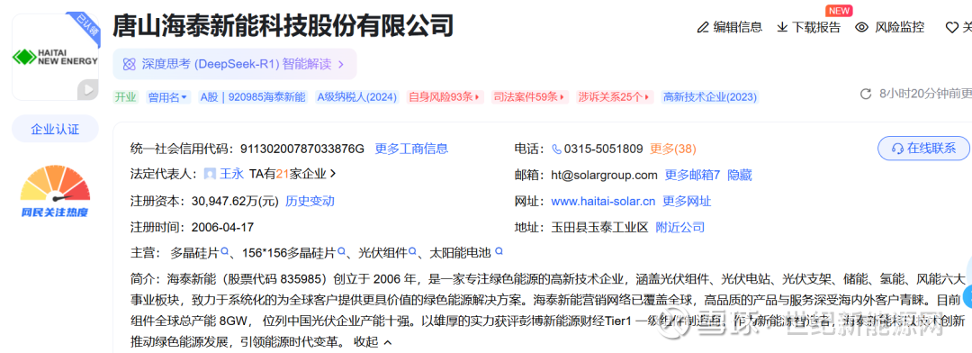 公开信息显示,唐山海泰新能科技股份有限公司成立于2006年4月17日,公司注册资本30947.62万元,董事长为王永,于2022年8月8日在北京证券交易所上市,公司证券简称为海泰新能,证券代码为920985.BJ。2025年三季度,海泰新能营业收入为14.32亿元,当期净利润为 -2.47亿元。