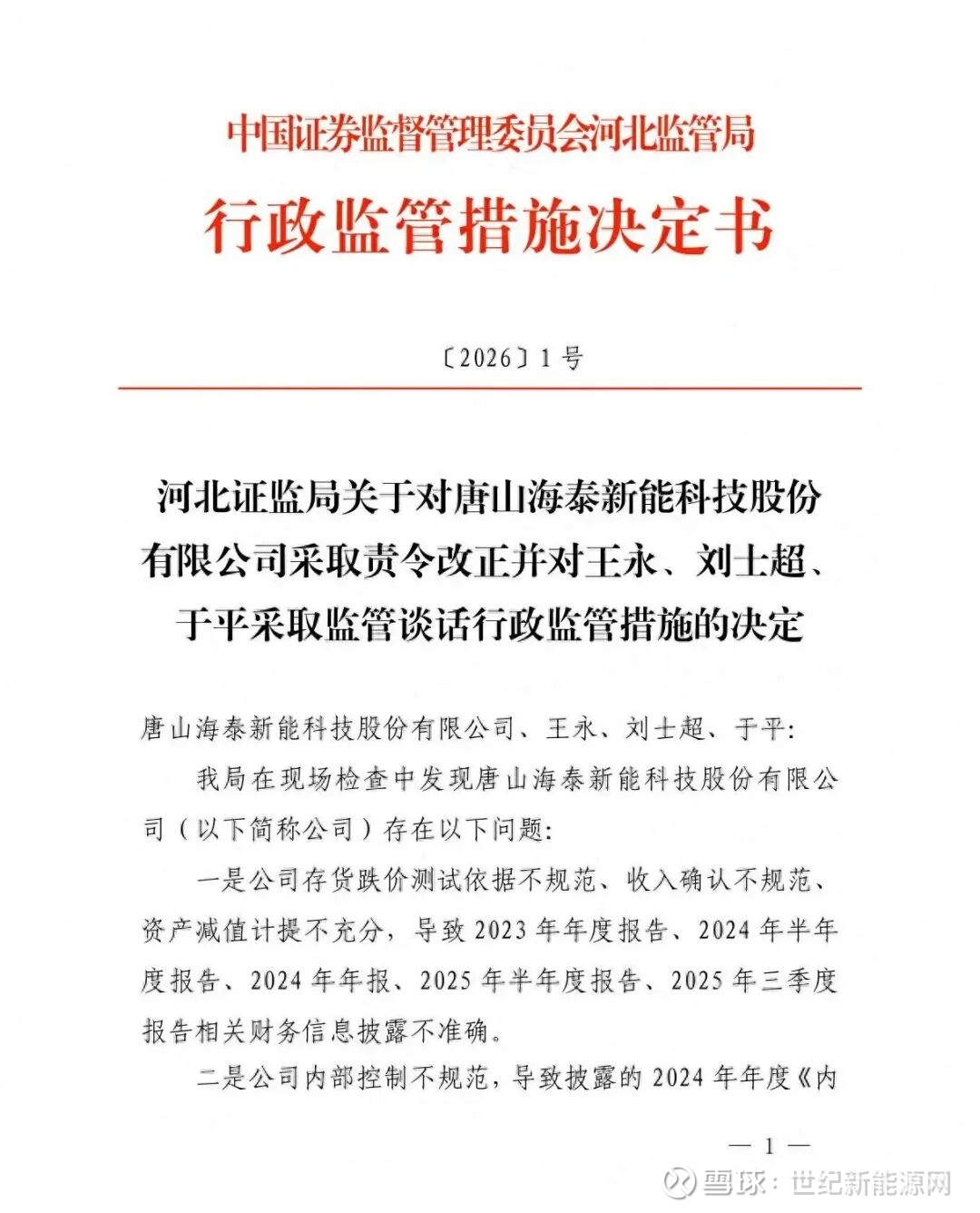 近日,河北证监局发布行政监管措施决定书((2026)1号),针对唐山海泰新能科技股份有限公司及相关责任人王永、刘士超、于平采取监管措施。