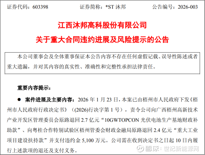 1月26日,江西沐邦高科股份有限公司(简称*ST沐邦,SH:603398)发布公告称,梧州市人民政府下发《梧州市人民政府行政决定书》,责令公司向广西梧州高新技术产业开发区管理委员会原路退回2.7亿元“10GW TOPCON光伏电池生产基地财政补助款”、向粤桂合作特别试验区梧州管委会财政金融局原路退回2.4亿元“重大工业项目建设扶持款”并支付违约金5,100万元。公司需在收到决定书之日起10日内履行上述款项的退还及支付义务。