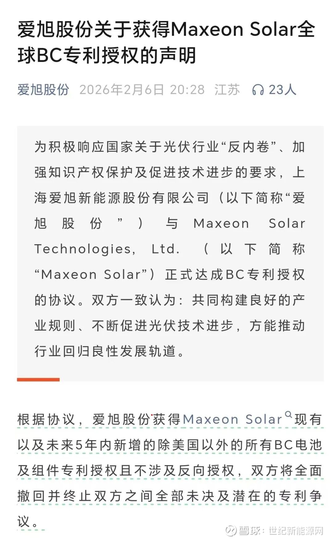 就在昨天,2月6日,一重磅信息释出,爱旭与TCL中环子公司Maxeon正式达成授权专利相关的合作,终止专利争议。
