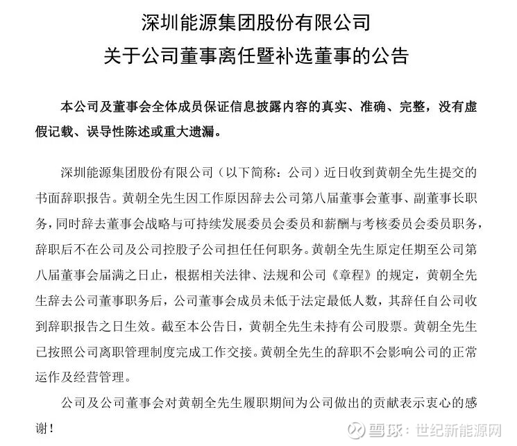 2月6日,深圳能源发布公告称,近日收到黄朝全先生提交的书面辞职报告。黄朝全先生因工作原因辞去公司第八届董事会董事、副董事长职务,同时辞去董事会战略与可持续发展委员会委员和薪酬与考核委员会委员职务,辞职后不在公司及公司控股子公司担任任何职务。